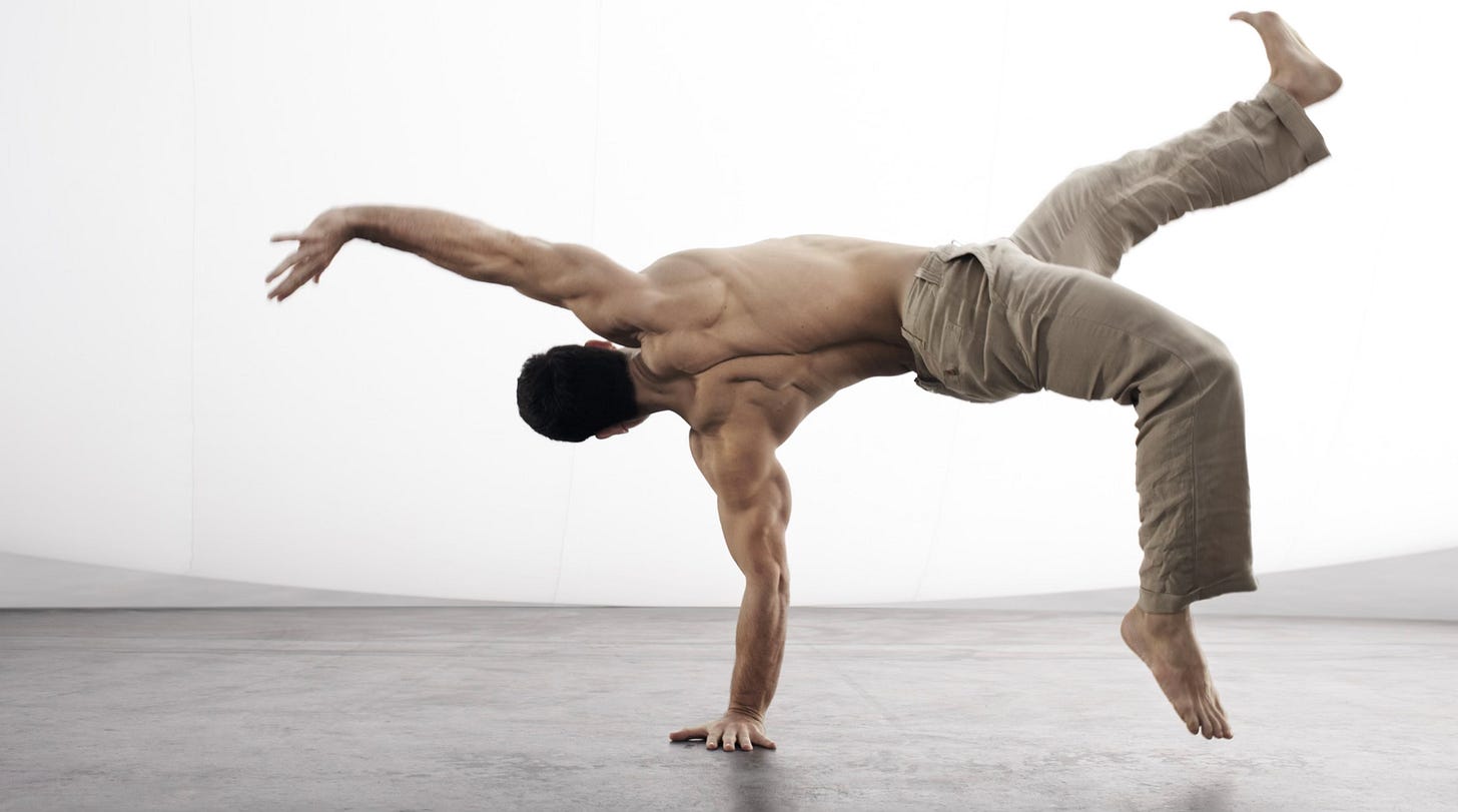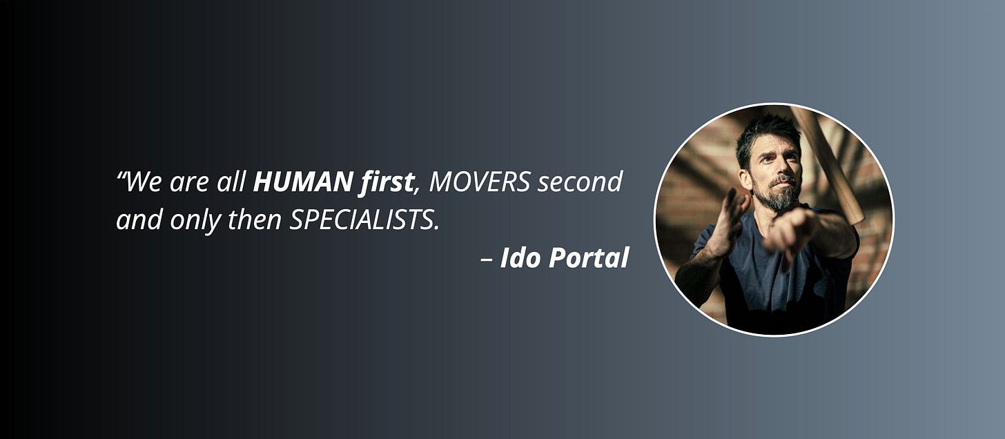 Talking about movement, I can’t not mention Ido Portal, the world’s foremost expert on human movement. Ido has spent a lifetime studying, combining and evolving elements from an enormous range of martial arts, dance genres and science to develop a unified theory and practice of movement called “The Ido Portal Method.”. He says: